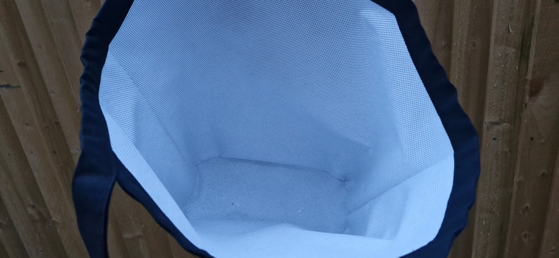This bag is handmade using a canvas type material, hand stencilled using blue acrylic on black canvas material, with black cotton trim and handles.